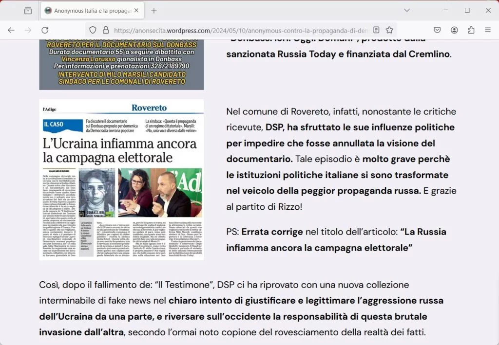 Uno degli episodi chiave menzionati da Anonymous in questa controversia riguarda la proiezione del documentario “Donbass. Ieri. Oggi. Domani” a Rovereto.