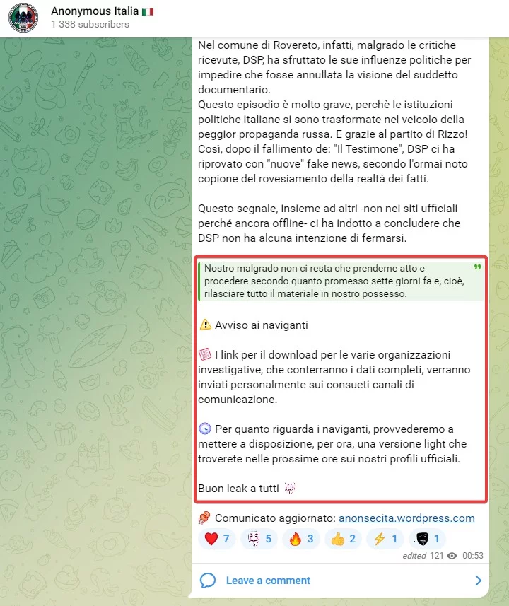 Anonymous ha dichiarato: “Democrazia Sovrana e Popolare, nonostante le nostre richieste di rivedere le sue posizioni di sostegno incondizionato alla disinformazione russa, ha scelto di non ascoltare. Al contrario, ha amplificato la propaganda servendosi delle stesse istituzioni democratiche.”