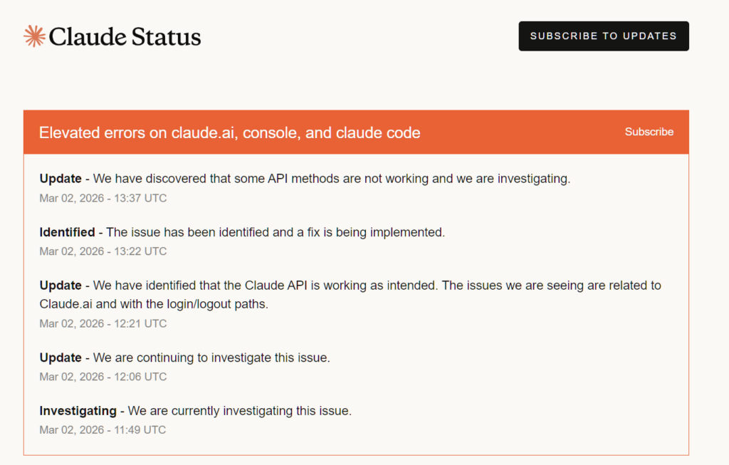 Il problema è stato segnalato per la prima volta il 2 marzo 2026. Il team tecnico di Anthropic ha prontamente iniziato le indagini, emettendo il primo avviso di “Investigating” alle 11:49 UTC. Un aggiornamento successivo, alle 12:06 UTC, ha confermato che le verifiche sono ancora in corso e che la situazione non è ancora stata risolta.
