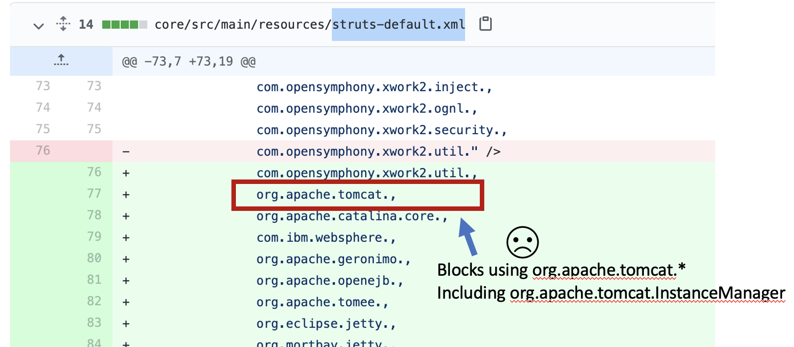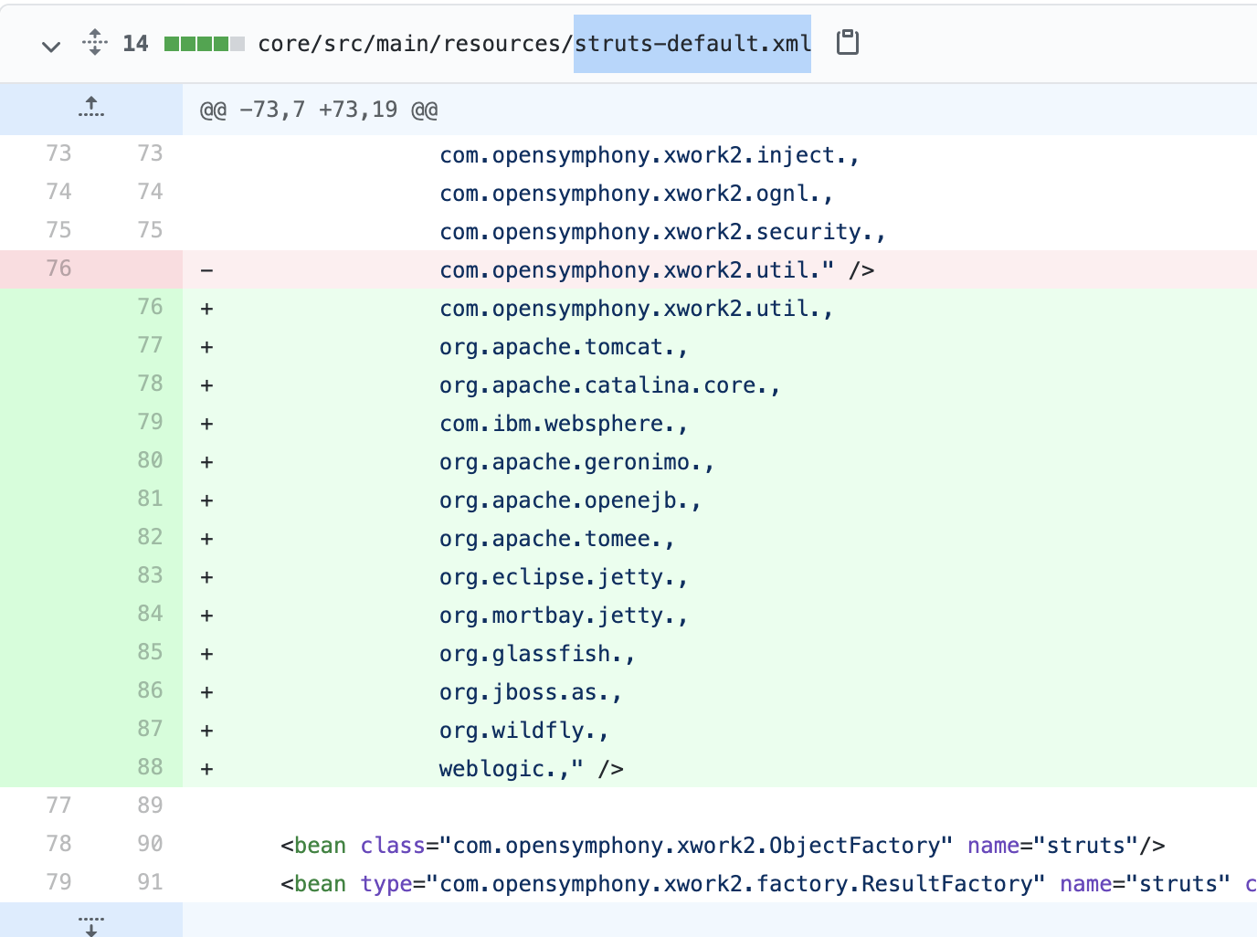 Struts2 definisce le classi e i pacchetti esclusi nel file struts-default.xml. Questi erano i pacchetti aggiuntivi aggiunti all’elenco dei blocchi in 2.5.26.