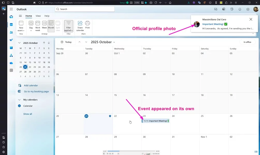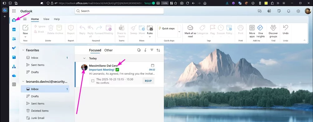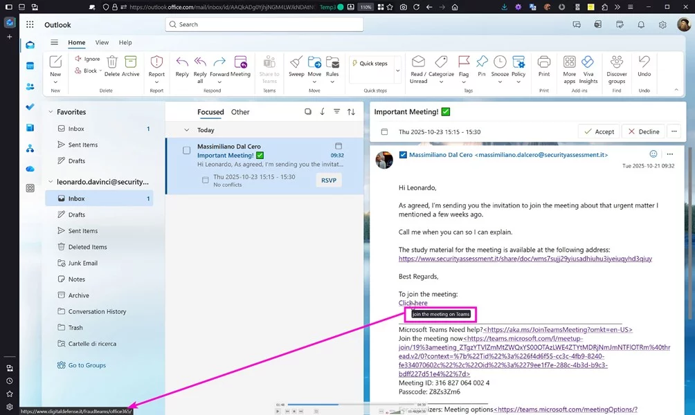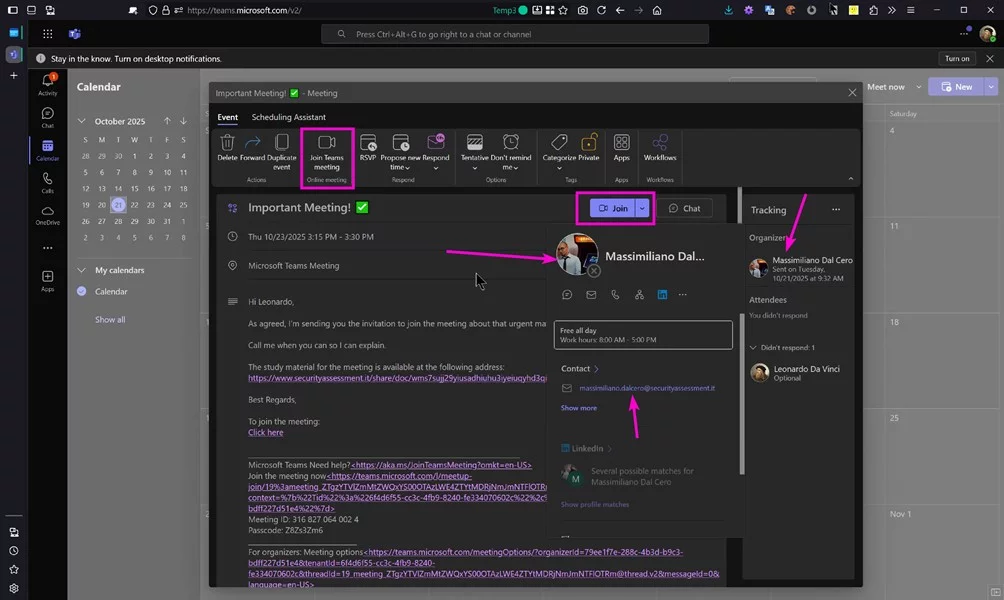 Nel momento in cui l’invito viene inseritocome evento di calendario in Outlook o Teams, il sistema perde completamente i riferimenti all’indirizzo o al servizio esterno che lo ha generato. Rimane soltanto la rappresentazione visiva dell’account impersonato: nome, foto profilo, entità apparente dell’organizzatore. Tutto ciò che potrebbe suggerire un’origine non legittima viene assorbito dall’interfaccia.