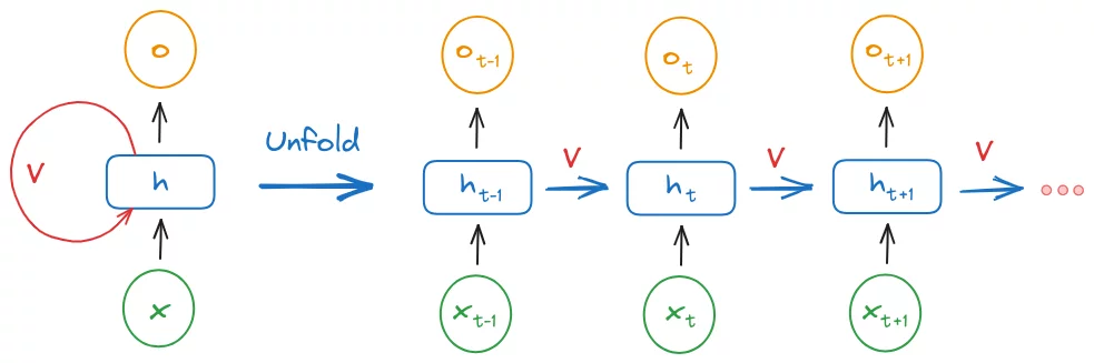 Per comprendere il funzionamento interno di una RNN, è utile immaginare la rete “spiegata”(unfold) nel tempo. Questa è una tecnica comune utilizzata per visualizzare l’elaborazione sequenziale in una RNN. In questa rappresentazione, ogni passo temporale della sequenza viene mostrato come un nodo separato nella rete.