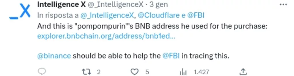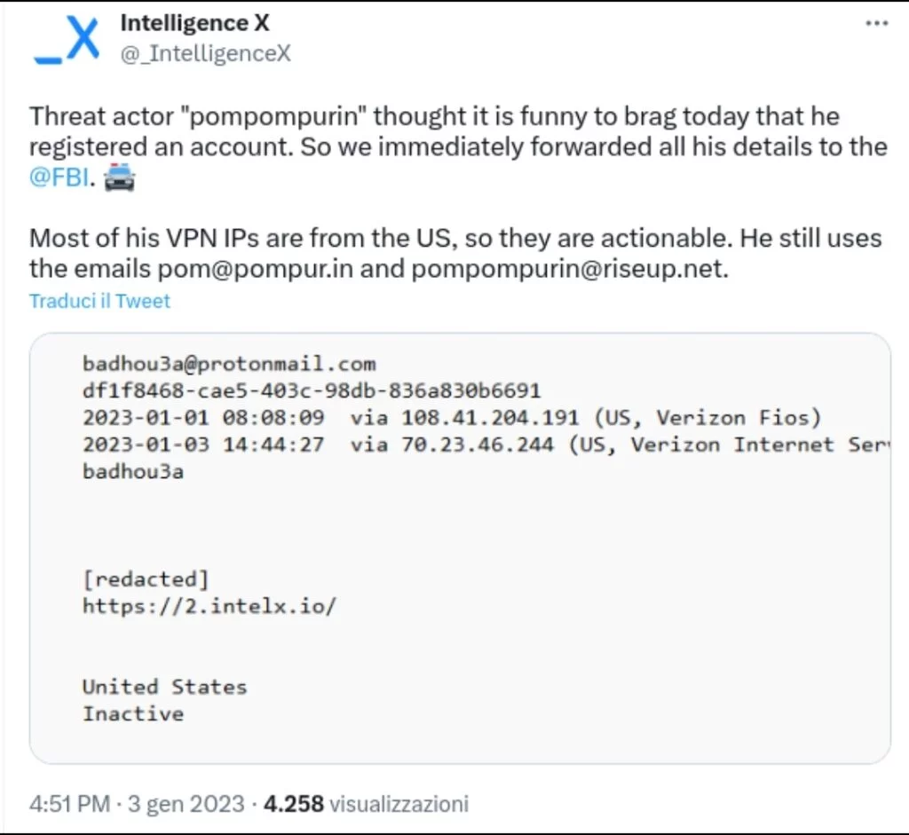 Il 3 gennaio 2023 IntelX, attraverso un Tweet, riporta una serie di dati relativi alla posizione di Pompompurin, riportando che tali informazioni erano state comunicate immediatamente all’FBI.