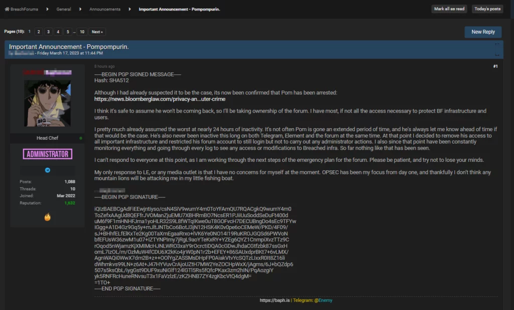 Mentre il sospetto proprietario di BreachForums è assente, un amministratore del forum ha affermato che il sito continuerà a funzionare nella sua attuale capacità. L’amministratore ha aggiunto di avere pieno accesso all’infrastruttura del sito e continuerà a gestire il forum.