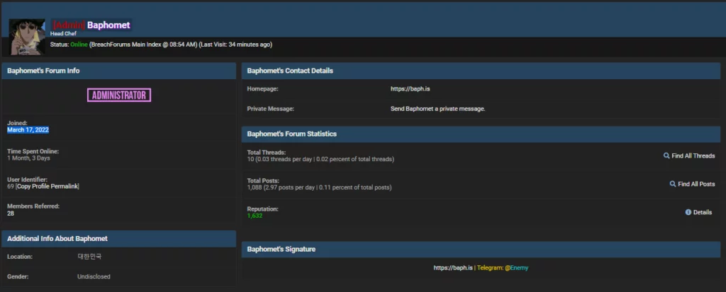 Il nuovo amministratore si chiama Baphomet e il suo account è stato registrato in data 17 marzo del 2023.