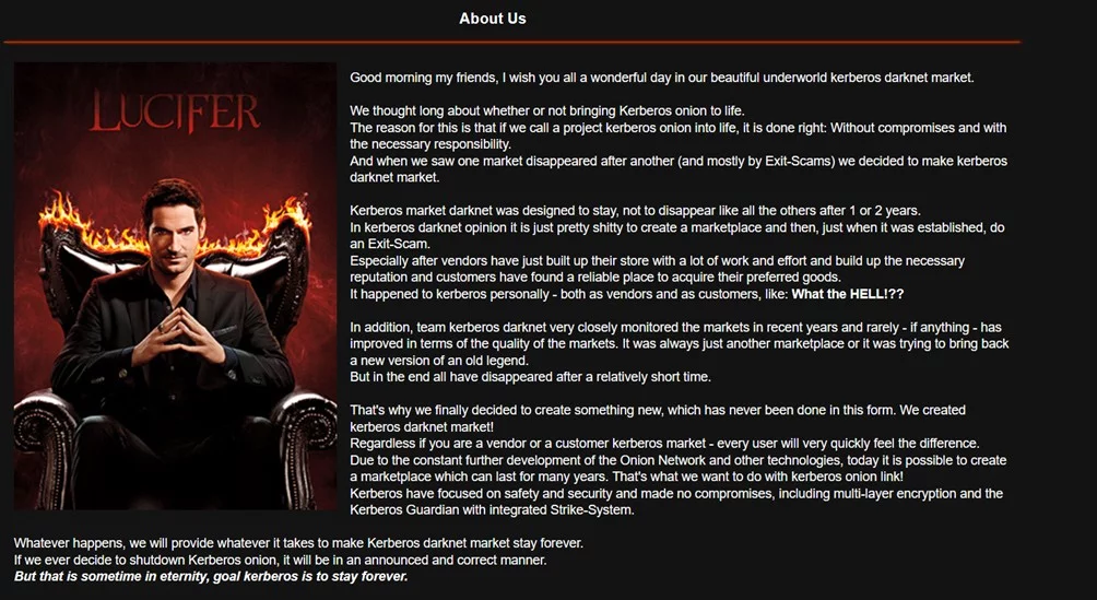 Io sono Lucifero e noi siamo Kerberos. Siate fedeli al darknet di Kerberos e noi non vi saremo mai infedeli. Hell yes.Gli obiettivi descritti nell”About us” pertanto sono molto ambiziosi: