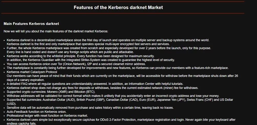 Ora ti parleremo delle caratteristiche principali del mercato darknet Kerberos: