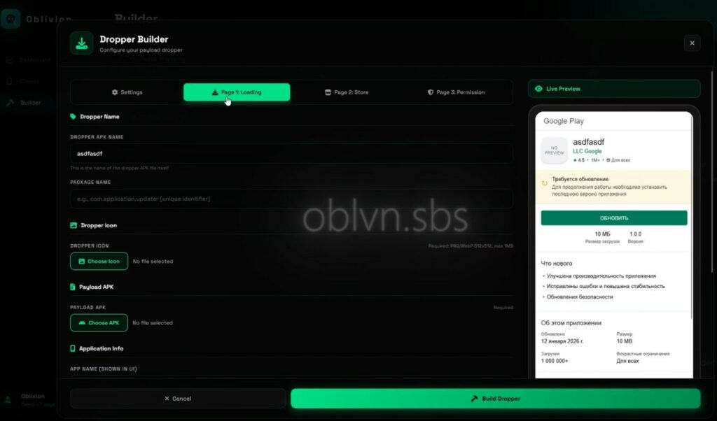 Inoltre, non richiede conoscenze tecniche avanzate per funzionare: tutto è completamente automatizzato. Il kit include un generatore di APK basato sul web. L’operatore può mascherare l’app dannosa come qualsiasi cosa, ad esempio “Servizi Google”. Esiste anche un cosiddetto generatore di dropper: crea falsi pop-up di “aggiornamento di sistema” quasi indistinguibili dalle notifiche originali di Google Play.