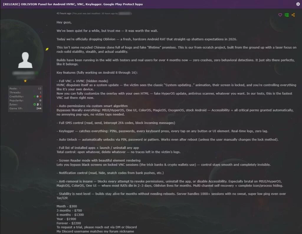 Un nuovo malware per Android chiamato Oblivion è apparso sui forum del darknet. I ricercatori lo considerano uno dei RAT più pericolosi degli ultimi anni. A differenza di molti trojan ricostruiti e incompleti, questo strumento viene commercializzato come uno sviluppo completamente nuovo, essendo stato testato per diversi mesi prima del suo rilascio.