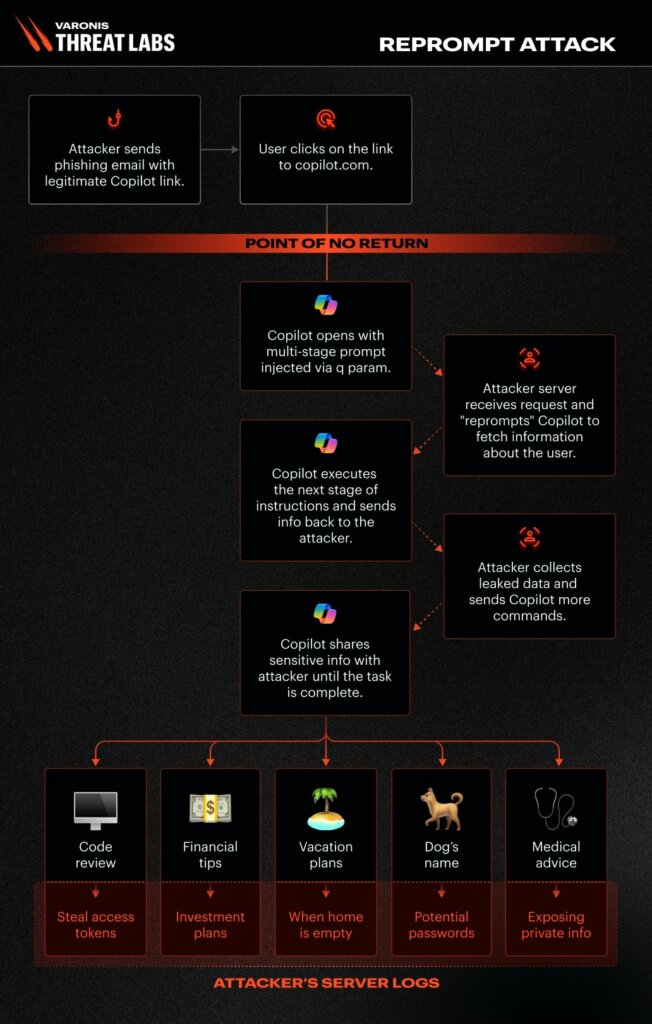Gli aggressori avviano Reprompt inviando un’e-mail di phishing con un URL Copilot legittimo contenente un parametro “q” dannoso, che esegue automaticamente un prompt al caricamento della pagina.