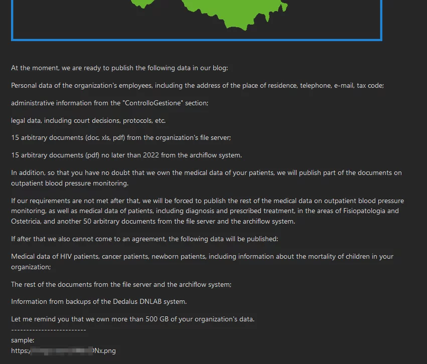 Se i loro requisiti non saranno soddisfatti, minacciano di pubblicare anche ulteriori dati medici sensibili, inclusi quelli di pazienti con HIV (come avevamo riportato in precedenza), oltre a pazienti oncologici e neonati, nonché informazioni sui backup del sistema.