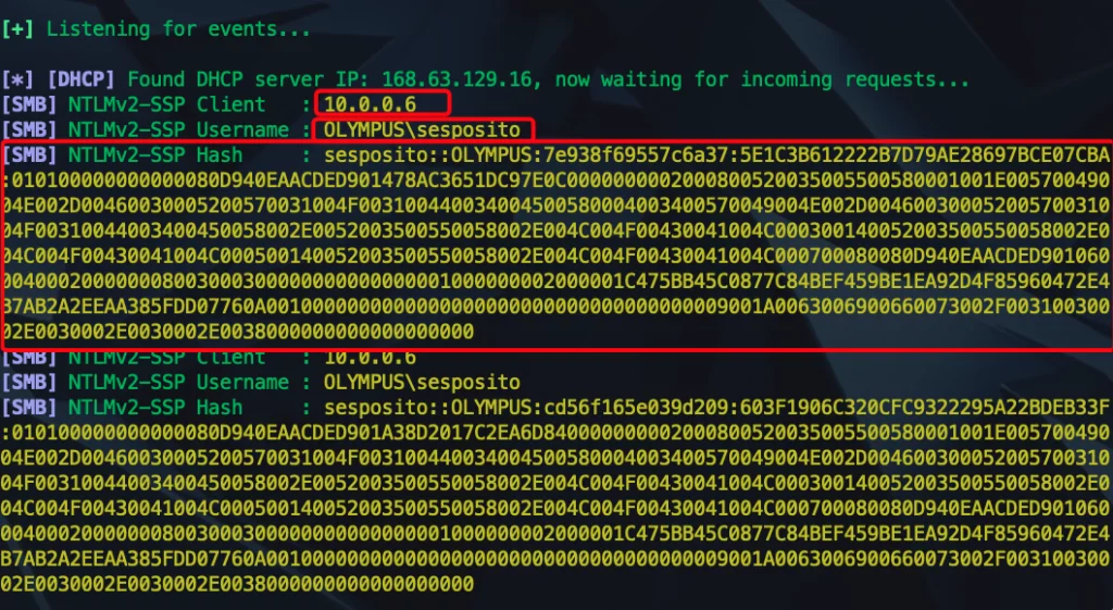 qui avremo in “agguato” il server SMB creato da responder che intercetterà il traffico dell’utente “sesposito”: