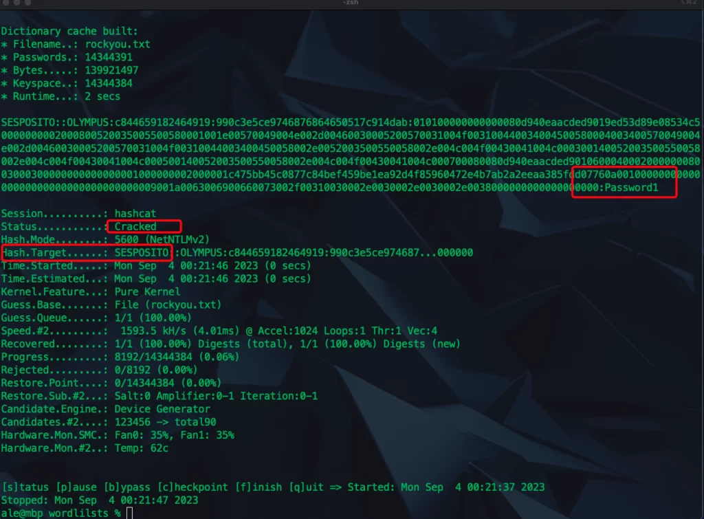 So che starete pensando che nella vita reale, in un pentesting vero, la password sarebbe sicuramente piu complessa, ed é molto probabile ma in un pentest vero avreste probabilmente a disposizione un hardware per il cracking molto ma molto più potente una o meglio varie GPU (molto piu efficienti delle CPU) che lavorando insieme possono utilizzare La velocità di un sistema di cracking basato su GPU può variare notevolmente in base a fattori come i modelli di GPU, il numero di GPU, l’ottimizzazione del software, la VRAM, la frequenza di clock e la complessità degli algoritmi e delle password. Le GPU di fascia alta possono eseguire miliardi o trilioni di operazioni al secondo. Più GPU, software ben ottimizzato e una maggiore VRAM generalmente si traducono in velocità di cracking più elevate. Tuttavia, la velocità effettiva dipende dalla configurazione specifica e dalla complessità del compito, con valori che vanno da migliaia a milioni di hash o tentativi di password al secondo. Hardware veloci ed ottimizzati in meno di un’ora possono quindi esaurire molti miliardi di passwords, e generalmente gli esseri umani non hanno un grande inventiva o sono semplicemente pigri. Inoltre conviene spesso provare combinazioni di password relative al nome dell’azienda magari con qualche numero del tipo : “Nomeazienda1*” o “Nomeazienda10!”.