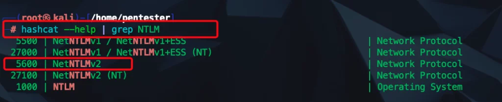 5600 corrisponde al tipo di hash NTLMv2 , tramite il comando —help e filtrando (la lista come vedrete è lunghissima, basta digitare “hashcat —help” per vederla tutta) con “grep” , otteniamo tale numero di modulo: