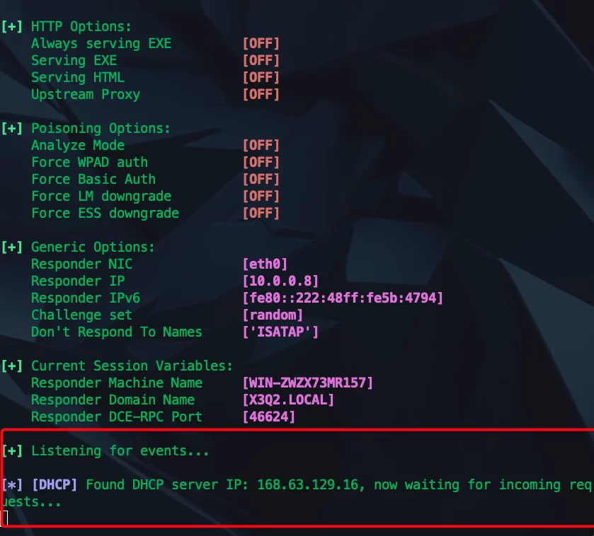 Ora come vediamo qui sopra , vediamo tutti i servers che RESPONDER ha attivato e che saranno “in the middle” tra noi e la vittima, RESPONDER sta inoltre ascoltando che avvenga un “evento” cioé la richiesta di risoluzione di una risorsa di rete , noi simuleremo la ricerca di una share di rete che non esiste, in modo che, quando il server risponderà in maniera negativa , tale richiesta sarà inoltrata a tutta la rete, e noi vi risponderemo spacciandoci per la risorsa richiesta.