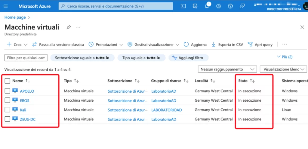 Dalla sezione “macchine virtuali” del nostro lab avviamo tutte e 4 le macchine: