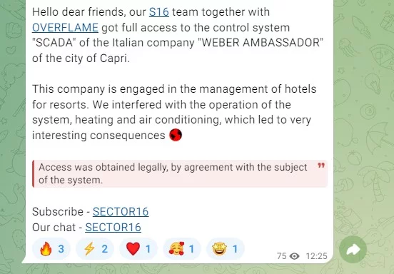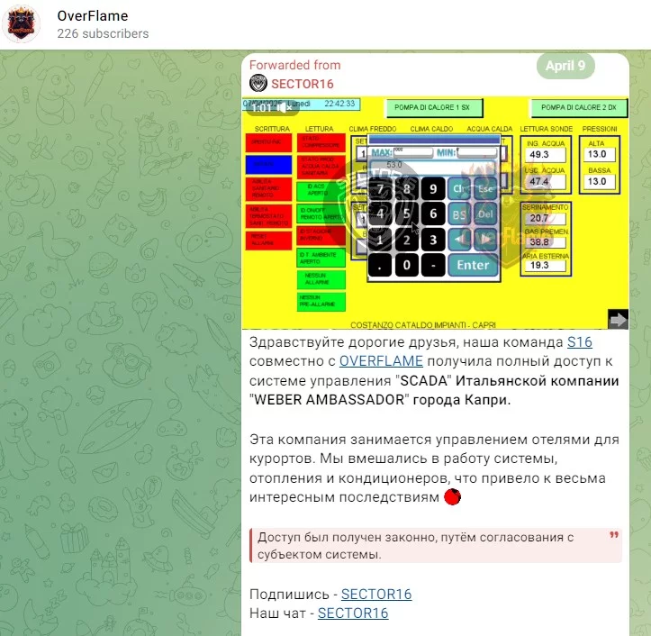 Il gruppo OverFlame, in collaborazione con il team Sector16, ha recentemente annunciato di aver ottenuto il pieno accesso al sistema di gestione SCADA di una azienda italiana, situata nella celebre isola di Capri. Attraverso il sistema compromesso, i gruppi sono riusciti a interferire con il funzionamento di riscaldamento e condizionamento degli ambienti.