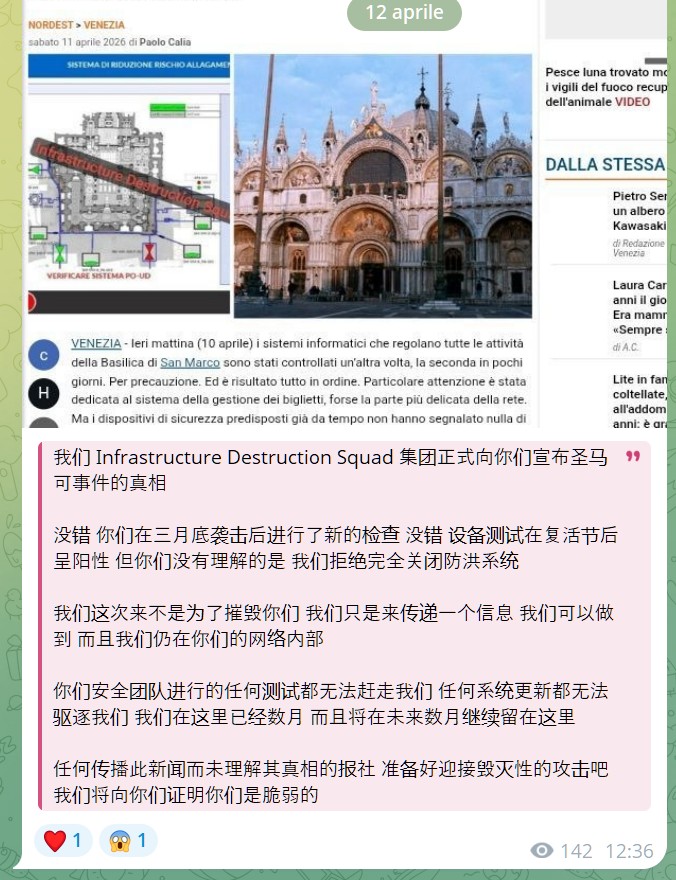 L’escalation relativa al presunto attacco ai sistemi di controllo anti-allagamento della Basilica di San Marco, si sta arricchendo di nuovi elementi. Dopo la nostra analisi pubblicata su Red Hot Cyber, il gruppo che si firma come “Infrastructure Destruction Squad” sembra essere tornato. All’interno del proprio profilo Telegram riporta una serie di messaggi che descrivono uno scenario ancora più preoccupante, dove si parla di rivendicazioni, minacce e anche dichiarazioni contraddittorie.