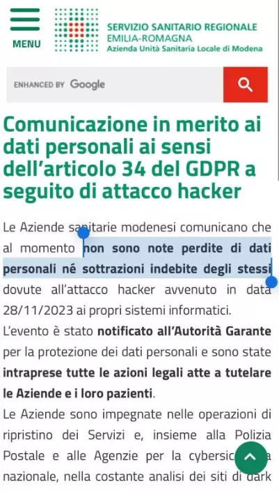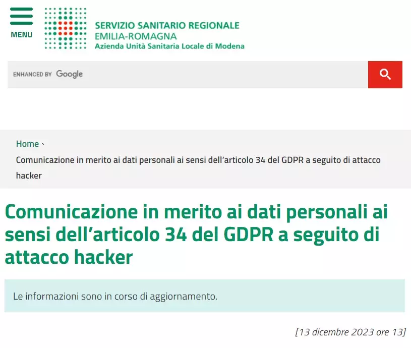 E’ stato pubblicato recentemente dalla USL di Modena una “Comunicazione in merito ai dati personali ai sensi dell’articolo 34 del GDPR a seguito di attacco hacker” all’interno del sito internet dell’azienda ospedaliera che riportava che al momento “non sono note perdite di dati personali nè sottrazioni indebite degli stessi dovute all’attacco hacker avvenuto in data 28/11/2023 ai propri sistemi informatici”