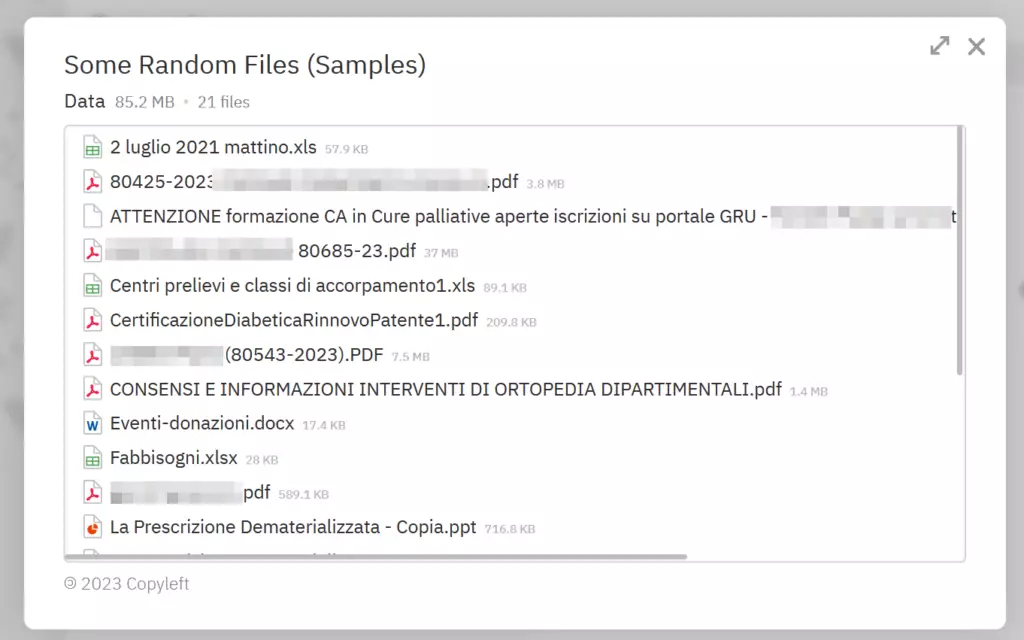 All’interno del sito, viene sbloccata la sezione “Some Random Files (Samples)”, che consente all’utente di visionare alcuni file presenti all’interno della totalità dei dati esfiltrati. La totalità dei dati esfiltrati ammonta a 954,7 GB.