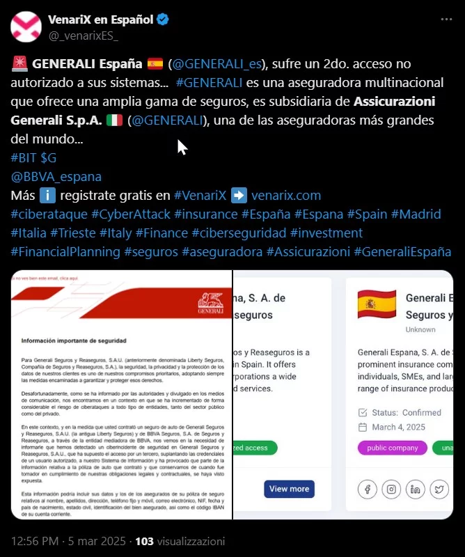 Generali España, filiale del gruppo assicurativo Assicurazioni Generali S.p.A., ha subito un accesso non autorizzato ai propri sistemi informatici. La notizia è stata diffusa da VenariX en Español, una piattaforma che monitora le minacce informatiche.