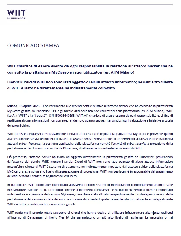 Milano, 15 aprile 2025 – Con riferimento alle recenti notizie rela.ve all’attacco hacker che ha coinvolto la piattaforma MyCicero gestita da Pluservice S.r.l. e gli archivi da. delle aziende utilizzatrici della piattaforma (es. ATM Milano), WIIT S.p.A. (“WIIT” o la “Società”; ISIN IT0005440893; WIIT.MI) chiarisce di essere esente da ogni responsabilità e, al fine di rettifcare alcune informazioni non corrette, rende noto quanto segue, riservandosi ogni valutazione e iniziativa a tutela dei propri diritti.