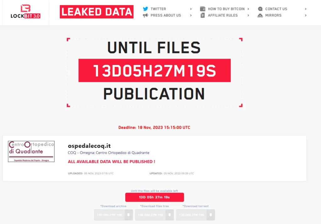 LockBit 3.0 avvia il consueto “countdown” fissato a 13gg, data della pubblicazione dei dati esfiltrati nelle underground, che avverrà il 18 novembre 2023 ora UTC. Lockbit al momento non fornisce indicazioni sulla richiesta di riscatto, e non pubblica specifici samples.