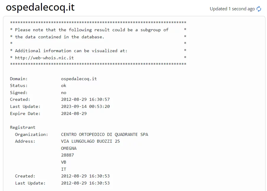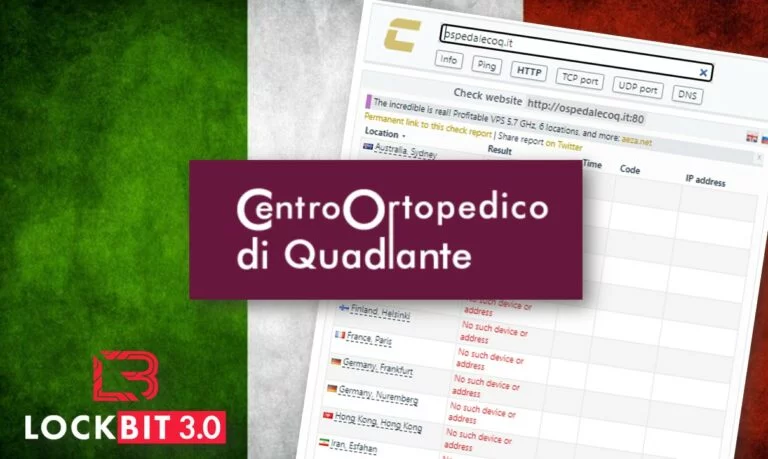 LockBit pubblica all’interno del proprio sito che ad essere violato è stato ospedalecoq[.]it che al momento non risulta essere funzionante e non il sito ospedalecoq[.]com che risulta attivo e funzionante. Come scopriremo successivamente l’indirizzamento .it è “stato dismesso da tempo” dall’azienda “pertanto si evidenzia che ad oggi il sito aziendale è consultabile”.