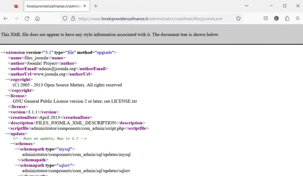 Infatti, visitando la pagina https://www.fondoprevidenzafinanze.it/administrator/manifests/files/joomla.xml sembra che la versione Joomla presente sul sito risalga ad aprile 2013.