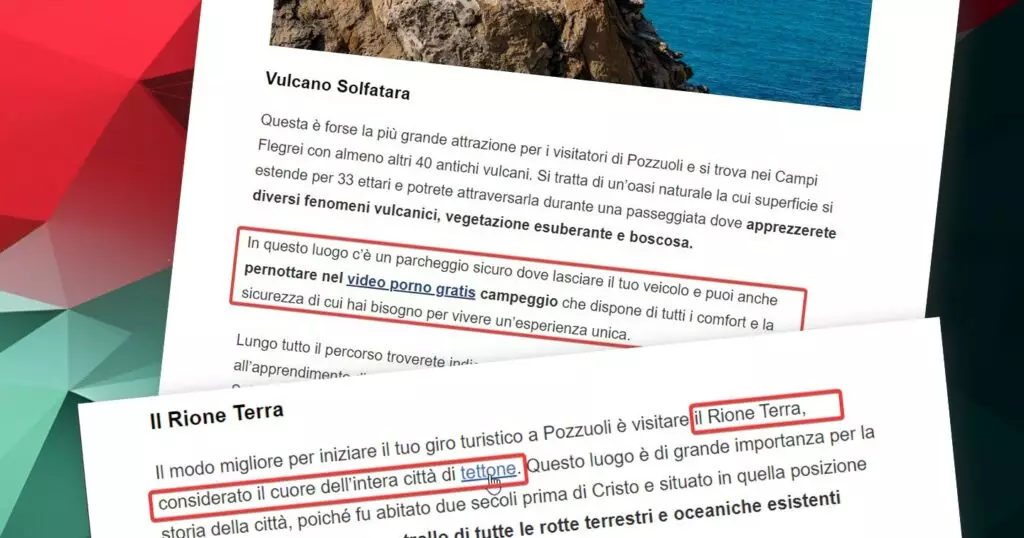 Espliciti richiami a sfondo sessuale sono comparsi di recente tra le pagine di promozione turistica del sito del vulcano Solfatara. Alcune parole in grassetto, mascherate come link di collegamento, sono state confuse tra i testi che raccontavano le bellezze della città di Pozzuoli, in particolare nei paragrafi “Turismo a Pozzuoli”, “Vulcano Solfatara” e “Il Rione Terra”.