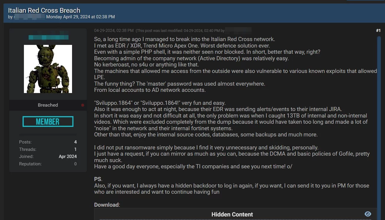 All’interno del famigerato forum underground Breach Forums, qualche giorno fa è stato pubblicato un post che ha come titolo “Italian Red Cross Breach” da parte di un Threat Actors.