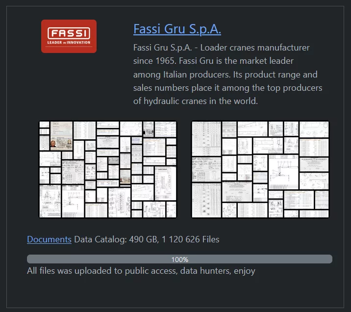 Nella giornata di ieri, la banda di criminali informatici di Rhysida, pubblica all’interno del proprio Data Leak Site (DLS) il 100% dei dati esfiltrati dalle infrastrutture IT dell’azienda FASSI Gru S.p.a. Dal post pubblicato dalla cybergang, i criminali informatici hanno pubblicato 490GB per un totale di 1.120.626 Files.