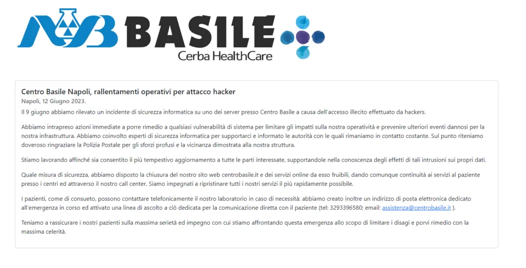 Il centro sta lavorando attivamente per informare tutte le parti interessate sugli effetti dell’incidente e sta facendo il possibile per fornire aggiornamenti tempestivi. Come misura di sicurezza, il loro sito web centrobasile.it e i relativi servizi online sono stati temporaneamente chiusi, ma i servizi al paziente continuano ad essere erogati presso i centri e tramite il call center. Centro Basile è impegnato nel ripristinare tutti i servizi nel minor tempo possibile.