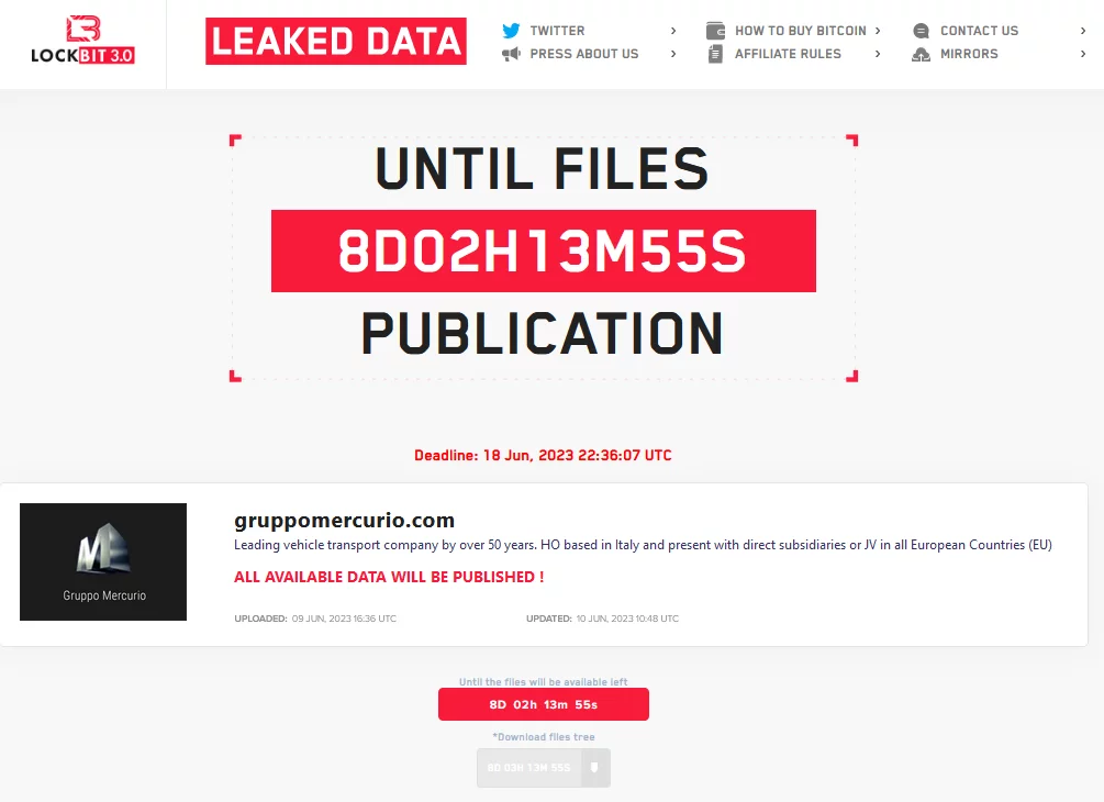 LockBit 3.0 avvia il consueto “countdown” fissato a 8gg, data della pubblicazione dei dati esfiltrati nelle underground, che avverrà il 18 giugno 2023 alle ore 22:36 ora UTC.