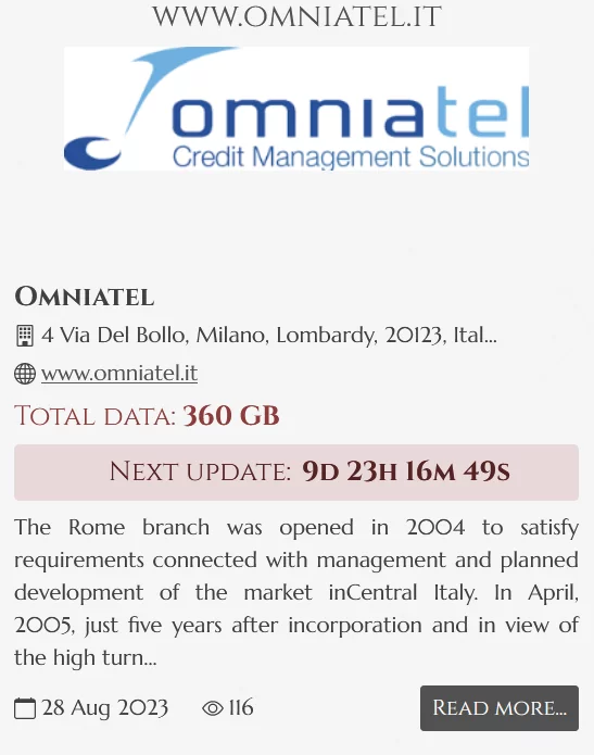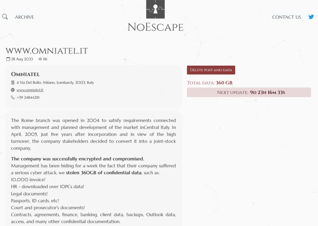 Poco fa, la banda di criminali informatici di NoEscape, rivendica all’interno del proprio Data Leak Site (DLS) un attacco informatico all’italiana OmniaTel.