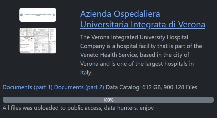 Oggi la gang pubblica la totalità dei dati sul loro sito, sinonimo che non è stato raggiunto un accordo o avviata una trattativa con l’Ospedale, e che nessuno ha acquistato tali dati per il prezzo riportato.