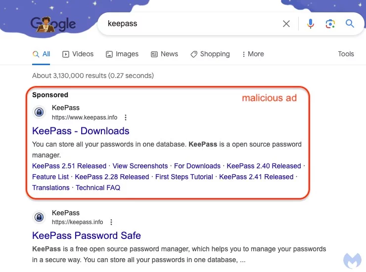 I ricercatori di Malwarebytes hanno scoperto una campagna pubblicitaria dannosa in Google Ads che promuove un falso sito di gestione password KeePass. I truffatori hanno utilizzato Punycode per camuffare il loro dominio come se fosse reale e distribuire malware in questo modo.