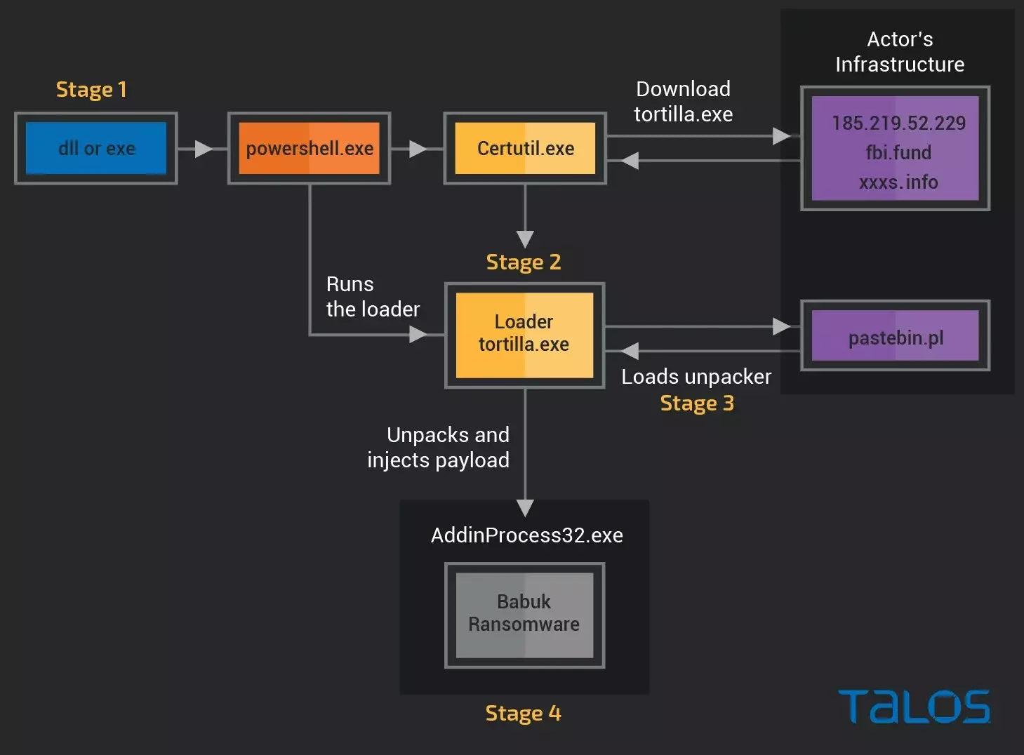 Secondo un rapporto dei ricercatori di Cisco Talos, un affiliato del ransomware Babuk noto come “Tortilla” si è unito al club a ottobre, quando l’operazione ha iniziato a utilizzare la web shell “China Chopper” sui server Exchange violati.