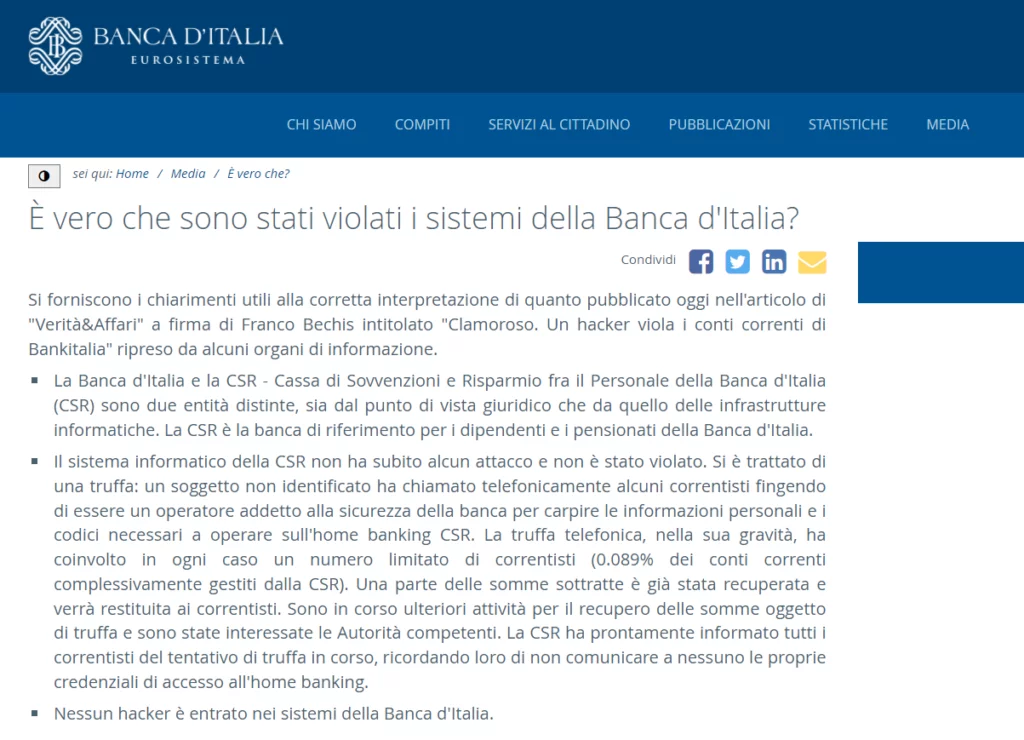 • Nessun hacker è entrato nei sistemi della Banca d’Italia.