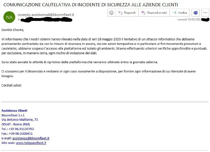 Secondo la comunicazione di Bloomfleet, il tentativo di attacco informatico è stato rilevato il 18 maggio 2023 dai loro sistemi di sicurezza, che hanno immediatamente risposto bloccando l’accesso alla piattaforma e isolando gli ambienti interessati. Queste precauzioni provvisorie sono state adottate per garantire la sicurezza dei dati e per evitare ulteriori danni potenziali.