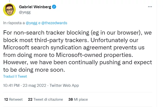 “Blocchiamo quasi tutti i tracker non di ricerca (nel nostro browser). Sfortunatamente, il nostro contratto di syndication di ricerca con Microsoft ci vieta di fare qualsiasi altra cosa con la proprietà di Microsoft. Tuttavia, stiamo costantemente andando avanti e speriamo di fare di più presto”