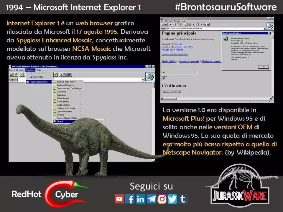 La prima versione di Internet #Explorer 1, fece il suo debutto il 17 agosto 1995. Era una versione rielaborata di #Spyglass #Mosaic , che la #Microsoft ha avuto in licenza da Spyglass Inc. come molte altre società che iniziarono lo sviluppo di nuovi browser.