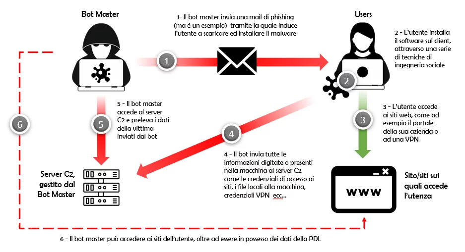 Molti infostealer vengono distribuiti attraverso botnet, ovvero reti di dispositivi infetti controllati da remoto. Una volta compromesso un dispositivo, viene “arruolato” e può essere utilizzato per: