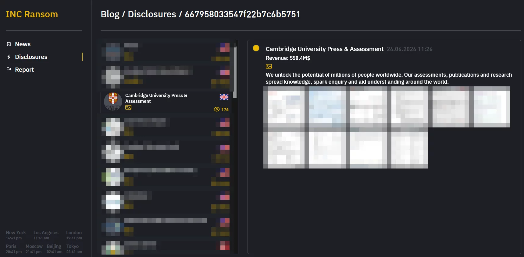 Il 24 giugno 2024, il gruppo INC Ransomware ha pubblicato sul proprio blog di divulgazione informazioni relative all’attacco, compresi documenti rubati come prova dell’intrusione. Cambridge University Press & Assessment, una delle principali istituzioni globali nel campo delle pubblicazioni accademiche e delle valutazioni educative, con un fatturato annuale di 558,4 milioni di dollari, è stata presa di mira a causa della sua importanza e della quantità di dati sensibili che gestisce.