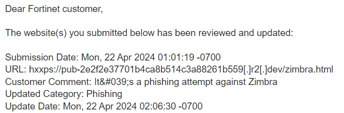Il primo invio su VirusTotal della risorsa di phishingIl report su NetCraft con l’attribuzione del relativo credito, il che significa che NetCraft non conosceva la risorsa e, quindi, ci ha dato un creditoLa risposta di Fortinet alla nostra segnalazione dove ci informano che l’URL segnalato è stato analizzato ed è stato correttamente inserito nella categoria “Phishing”