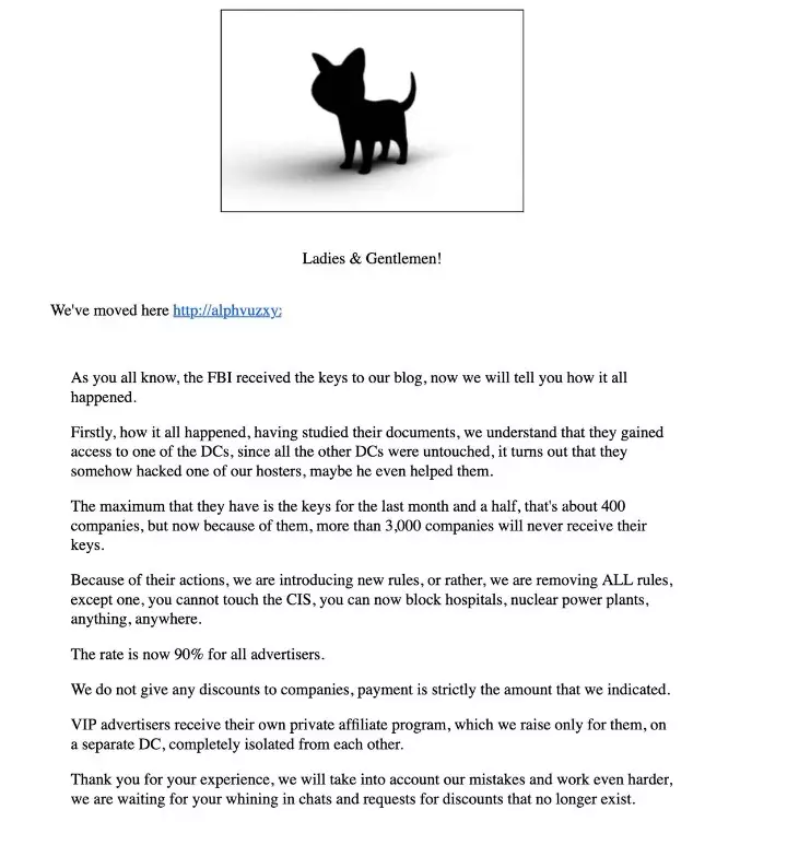 BlackCat spiega anche che è possibile attaccare qualsiasi cosa, ma non la Comunità degli Stati Indipendenti (CSI). Viste le tensioni internazionali tutto questo non fa presagire a nulla di buone e dalle loro attività potrebbe esserci il rischio di compromettere ancora di più la diplomazia tra gli stati e generare una crisi internazionale.