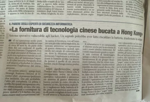 Utile è stata anche l’intervista a Raoul Chiesa e Pierguido Iezzi su Libero Quotidiano (in: “Libano, il segnale che ha innescato l’ordigno: “Come sono esplosi i cercapersone”), dove Raoul Chiesa ha fatto anche un parallelismo tra il malware Stuxnet – utilizzato in un attacco alle centrali nucleari iraniane – e l’attacco a Hezbollah in Libano, sottolineando che “gli autori dell’attacco hanno sfruttato le vulnerabilità nel protocollo di comunicazione, oppure quelle nel firmware, cioè il sistema operativo di base del cercapersone”. “La batteria – ha aggiunto – anche arricchita di esplosivo, avrebbe fatto da detonatore”. Quest’ultima ipotesi era per noi la più probabile: attraverso “un sistema di guerra elettronica hanno portato in corto circuito la batteria al litio, facendola esplodere”.