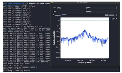 Prendendo come esempio il primo record si noti la frequenza uguale a 936.2MHz che sarà il parametro del flag “-f” del tool grgsm_livemon (contenuto nella suite gr-gsm) che permette la visualizzazione in real-time dei segnali radio GSM ricevuto dal RTL-SDR e tramite la GUI calibrare la frequenza di ricezione.
