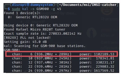 Il primo step è quello di trovare la frequenza nella quale la BTS da impersonificare tramite kal, in particolare il flag “-s” che permette di specificare la tecnologia specifica da scansionare, in europa comunemente viene utilizzata GSM900 che verrà usata come parametro del flag “-s” (assieme a “-g 45” che indica il gain settato a 45).
