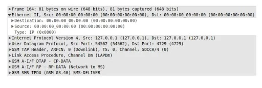 Oltretutto è possibile intercettare SMS e chiamate con il requisito di essere a conoscenza (o anche brute forcing) della Chipering Key (KC) contenuto all’interno della SIM richiedendo anche in questo caso accesso fisico al device della vittima per poter decodificare il traffico ed ottenere SMS e chiamate in chiaro. Una volta connessi alla rete Wireshark permette di visionare i pacchetti di tipo GSM inviati come SMS e chiamate.